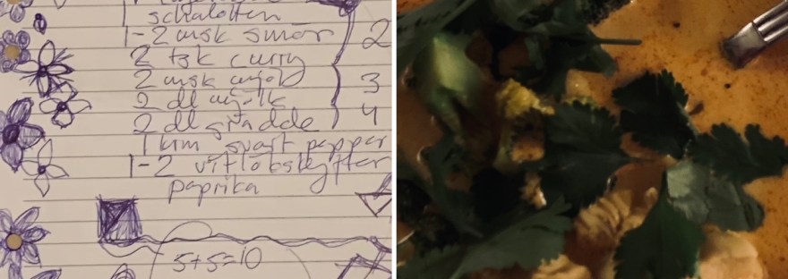 Formellt heter den här soppan Indonesisk Kycklingsoppa. Jag själv kallar den Louise och Sunes suveräna kycklingsoppa, efter mina kära släktingar och dessutom tidigare ”chefer” på legendariska Café Göken. Man tror att soppan är rätt medelmåttig om man bara ser receptet. Jag själv hade nog inte lagat den om jag bara hade sett ingredienserna. Särskilt inte om man tittar på mitt recept på bilden men så ser det ut på många av mina papper i receptlådan. Papperen har använts till en massa annat kladd också, som matteläxor 😊. Men har man smakat på den så vill man ha den igen och igen! Den är så god i sin enkelhet.