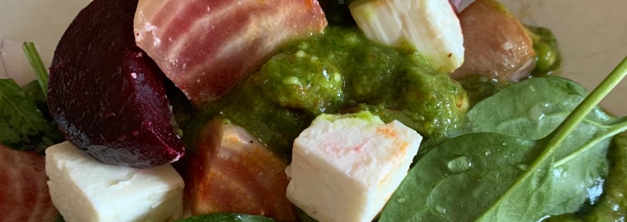 Mixa peston enligt receptet. Sätt ugnen på 225 grader. Borsta rotfrukterna och skala de som behövs skalas men behåll skalet på de ekologiska rotfrukterna som inte är fula – det är i skalet mycket av näringen och smaken sitter. Dela i jämnstora bitar, ca 3 cm. Lägg dem på en plåt – rödbetor för sig – och gnid in olja och salt. Rosta mitt i ugnen i ca 25 minuter och rör om en gång under rostningen. Känn med sticka, det är bättre med en kärna än att de är för mjuka. Blanda med spenaten eller salladen, hackad chili eller chilisås och osten samt löken om du väljer att ha med den. Klicka pesto uppepå. Ät som det är eller tillsammans med kött eller fisk.