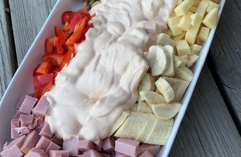 Ett mellanting mellan godis och mat. Så beskriver jag den här ”salladen” som jag nästan skäms för att presentera. Vet inte varför. Kanske för att den är banal, kladdig och onyttig på samma gång. Men jag kan inte motstå. För den är himla god! Och funkar utmärkt som mat om du inte vill tänka på vare sig näringsinnehåll eller antal kalorier. Den fanns med i Salladsboken från 70-talet men går inte att googla på nu – jag har i alla fall inte hittat den. Har ätit och älskat den sedan barnsben. När jag pluggade åt jag den ibland till både middag och frukost i sängen, när jag tyckte att jag var värd något gott. Om man säger såhär; jag har fått folk på fall med den här men det är inte det första jag bjuder på om jag vill briljera rent estetiskt. Den läggs upp fint i grupper på fat – så fint som det går med de ganska färglösa ingredienserna – och innan en äter blandas allt ihop (inte lika fotovänligt så jag har fotat innan kalaset blandats).