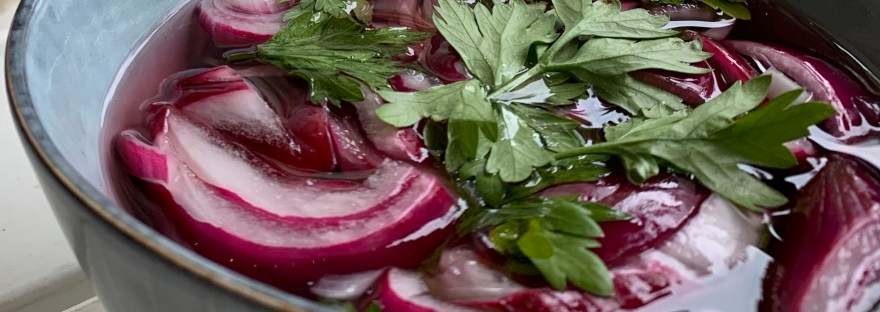 Picklad rödlök går att äta till det mesta. Inte minst till tacos, wraps, burgare och chiligrytor. Ta gärna den här picklade varianten istället för råhackad lök till lite mer spicy rätter. Vinägern och sötman bryter bra mot hettan. Denna är enkelt gjord i en 1-2-3-lag. Hur lätt och gott som helst och den håller länge i kylen. Det viktiga är att den får stå och dra åt sig smakerna i kylen ett tag innan den serveras. Persiljan behövs inte men jag gillar ju persilja.