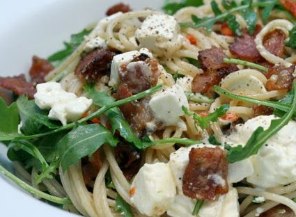 Koka spagettin men inte i för mycket vatten, det ska bara täcka pastan eftersom du ska använda lite av det stärkelserika vattnet för att binda ihop rätten på slutet. Tärna fetaosten. Skrubba limen i ljummet vatten. Riv skalet med ett fint rivjärn. Skala och finhacka vitlöken. Kärna ur och strimla chilin (eller behåll kärnorna om du vill ha mer hetta). Strimla eller tärna baconet. Stek baconet knaprigt i en stekpanna. Tillsätt limeskal, vitlök, chili och kapris. Eller stek baconet separat och resten i olja om du vill kunna servera någon av portionerna vegetariskt. Låt spagettin rinna av, men spara lite av pastavattnet. Dra stekpannan från värmen och tillsätt fetaost och ruccola och eventuellt persilja, babyspenat eller halverade coctailtomater. Pressa över limejuicen och ta i lite av pastavattnet så att du får en krämig konsistens på såsen. Blanda med pastan.