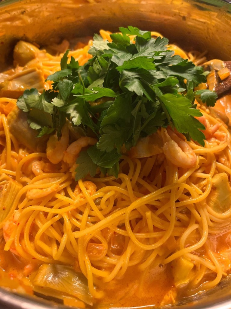 Jag är väldigt förtjust i saffran i matlagning och en krämig pastasås med saffran och räkor är ju bara så gott! Här är en variant som du tillagar på ungefär samma sätt som risotto, istället för att förkoka pastan. Jag har även lagt till kronärtskocka som jag också är väldigt förtjust i. I den här snackar vi mycket smör, för den som är rädd för att bli smal, men det går naturligtvis att minska mängden.