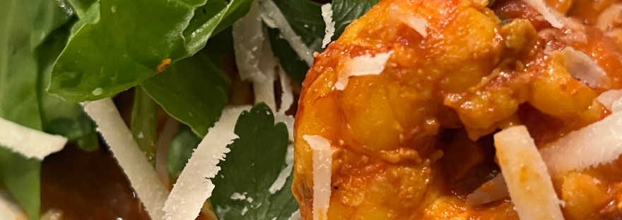 Lägg räkorna i tomatsåsen och låt de bli varma men de får inte koka. Lägg också i färska örter om du har såna. Dra från värmen. Servera i djupa tallrikar med riven ost.