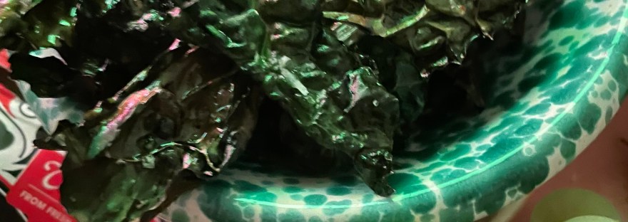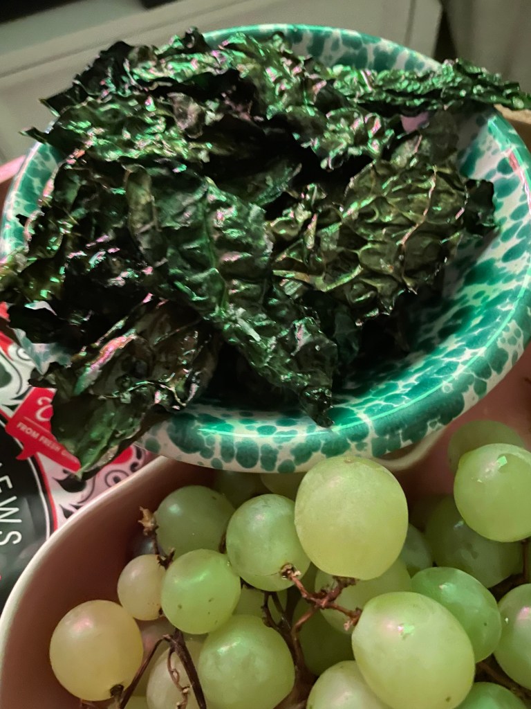 Det här är ett favoritsnacks hos mig – så himla gott! Mycket godare än köpepotatischipsen. Det gör ju inget att de dessutom är betydligt nyttigare och väldigt enkla att göra. Den här gången hade jag svartkål, eller palmkål som den också kallas, hemma men ofta blir det grönkål som är lättare att få tag på och precis lika gott.