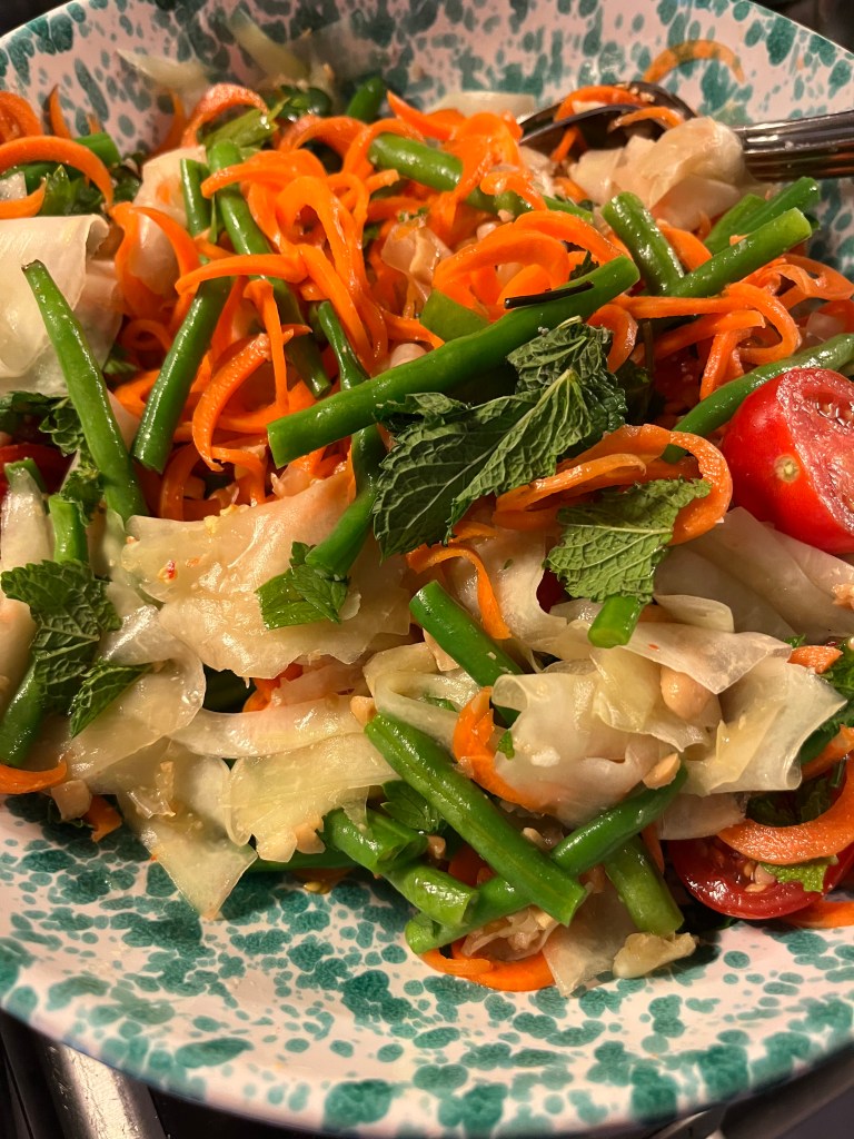 Som tam – en superhet, lite syrlig och chrunchig sallad – är en perfekt sidorätt som hamnat på många topplistor över det godaste man kan äta. Den passar särskilt bra till thailändsk mat och till friterat men även till en grillad kött- eller fiskbit. Eller varför inte till larb