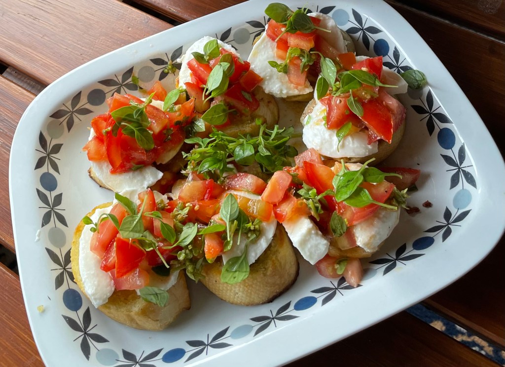 Bruschetta passar alldeles förträffligt som förrätt, tillbehör eller tilltugg – särskilt på sommaren när tomaterna är som finast. En återkommande klassiker hos oss. Fräscht och smakfullt tillsammans med en fin olivolja, färsk basilika och det vitlöksstekta brödet. Mozzarella vill jag ha men riven parmesan eller pecorino blir också gott, eller bara som den är utan ost.
