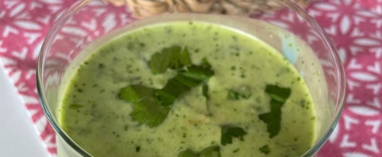 Skölj citrusen noga – särskilt om den inte är ekologisk – och riv det yttersta av skalet. Grovhacka skalad ingefära och vitlök. Grovplocka koriandern, en del av stjälkarna får gärna vara kvar. Lägg några av bladen åt sidan till senare. Grovklipp även eventuella persiljeblad. Kärna ur och strimla eventuell chilifrukt och lägg några strimlor åt sidan till senare. Mixa alla ingredienser med en stavmixer eller blender. Blanda i de sparade korianderbladen och chilistrimlorna. Klart!
