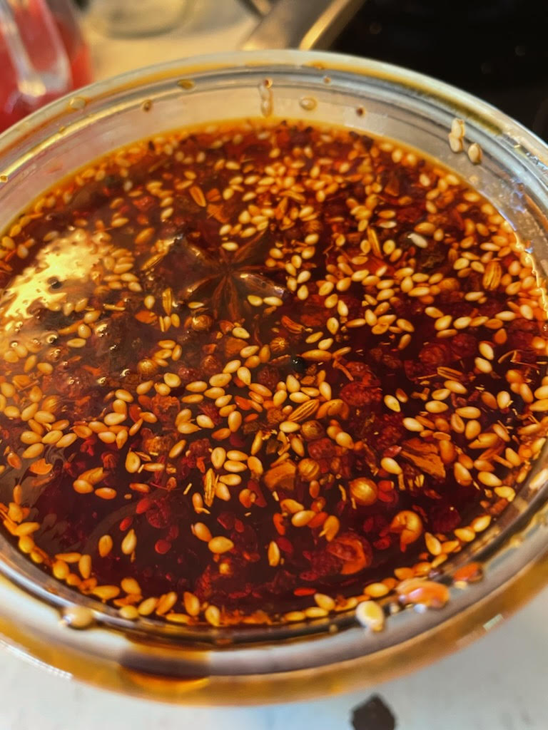 Värm oljan till 180 grader (använd termometer) och häll försiktigt oljan över alla ingredienser i skålen. Det kommer att bubbla och eftersom oljan är väldigt het är det viktigt att vara försiktig. Låt chilioljan svalna och ställ den att mogna i kylen över natten. Plocka sedan bort vitlöken och eventuellt ingefäran och lagerbladen. Om du vill kan du sila oljan. Häll upp i en väl rengjord burk eller flaska så håller den många veckor i kylen.