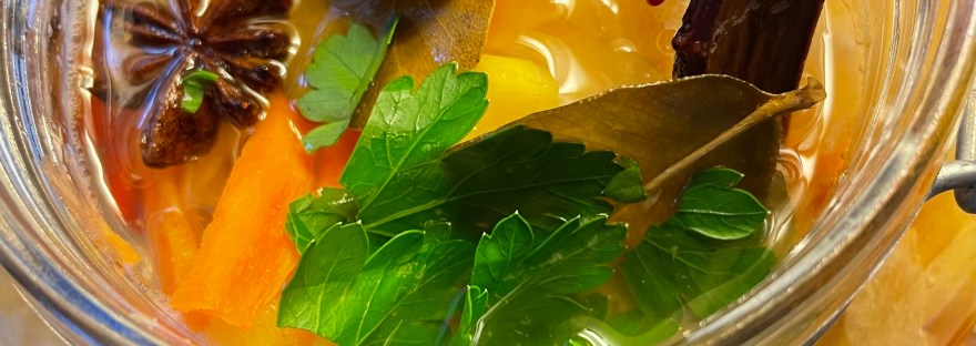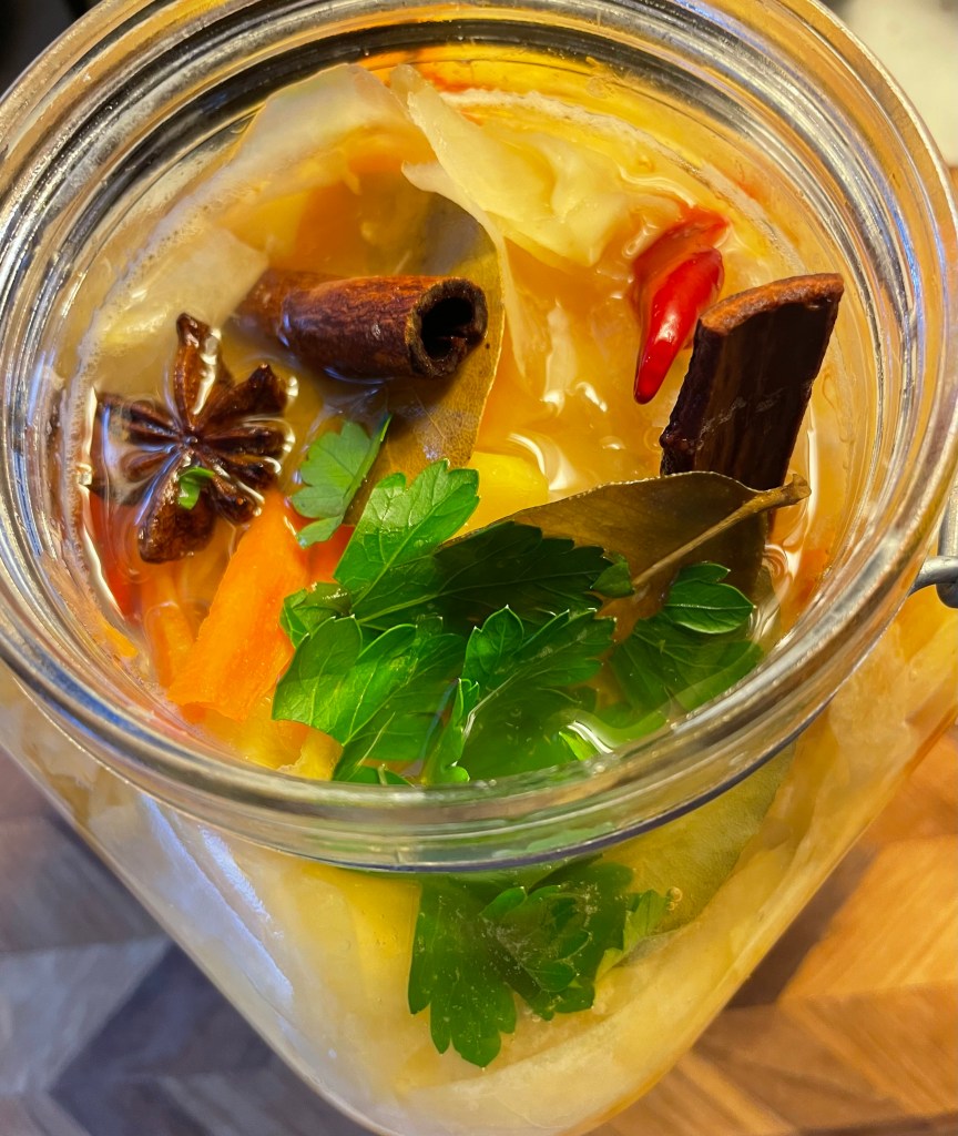 Jag har valt en lite asiatisk touch på mina pickles: Ingefära, kanel, stjärnanis, chili och limeblad blir toppen tycker jag.